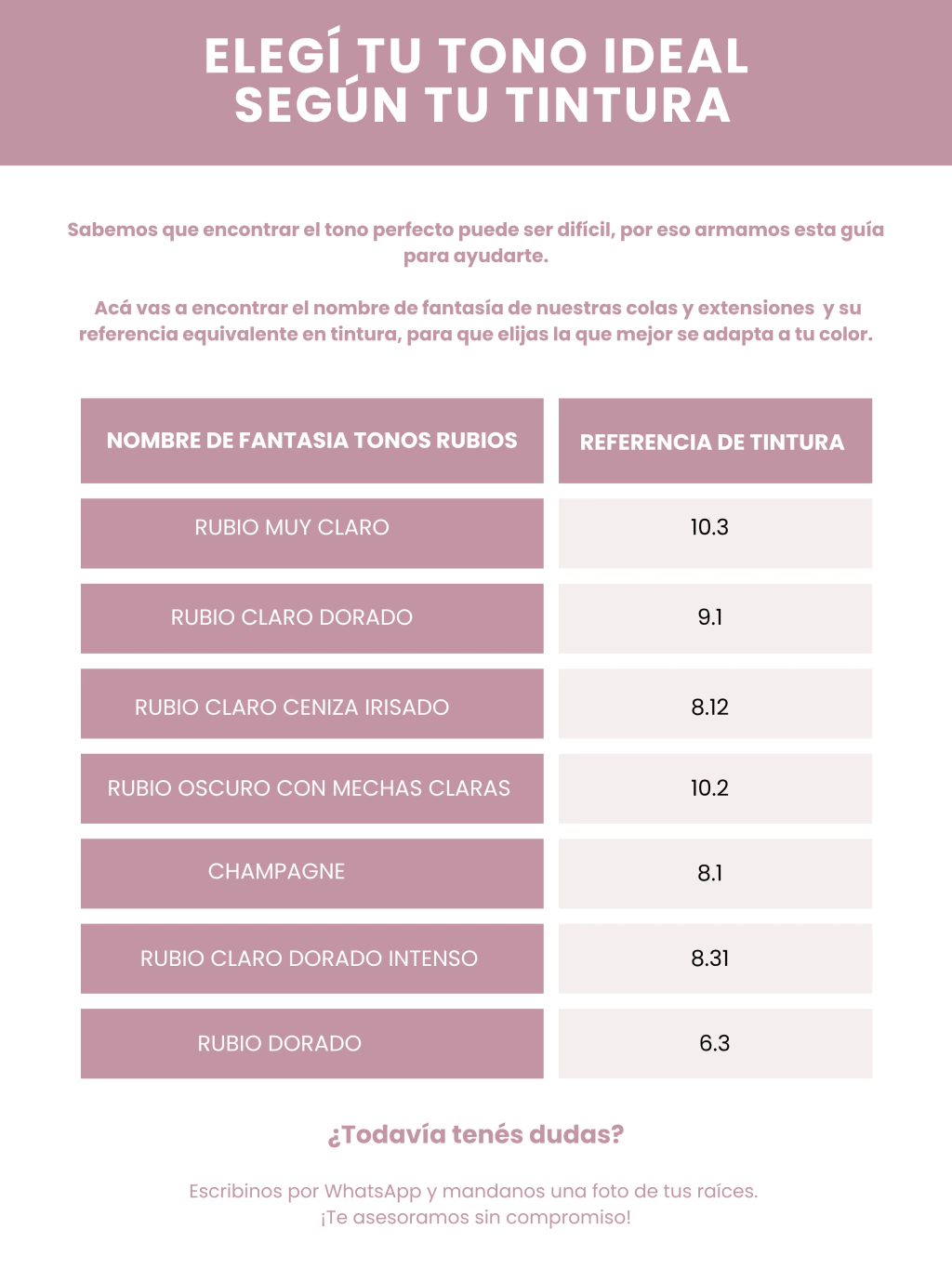 Rubio claro dorado (ondulada) Rubio claro ceniza irisado (ondulada) Rubio claro dorado intenso (ondulada) Rubio claro dorado intenso (laciaa) Rubio oscuro con mechas claras (lacia) Rubio oscuro con mechas claras (ondulada) Champagne (ondulada) Rubio dorado (lacia) Rubio medio cobrizo (ondulada) Rubio medio cobrizo (lacia) Rubio oscuro dorado intenso(ondulada) Rubio oscuro dorado intenso(lacia) Rubio oscuro dorado intenso + Rubio dorado(lacia) Rubio oscuro dorado intenso + mechas rubio claro(ondulada) Rubio oscuro dorado intenso + mechas rubio claro(lacia) Castaño claro irisado (lacia) Castaño claro irisado (ondulada) Castaño oscuro(lacia) Castaño oscuro(ondulada) Negro(lacia) Negro(ondulada) Borravino (ondulada)